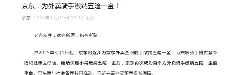| 金融界2月19日消息外卖平台战火重燃!这次发力的方向首次聚焦外卖小哥的权益。 19日上午,在在外卖赛道动作频频的京东率先出招,推出了为京东外卖全职骑手缴纳五险一金的“大招”。京东在通知中提到将自2025年3月1日起,京东将逐步为京东外卖全职骑手缴纳五险一金,为兼职骑手提供意外险和健康医疗险。成为首个为外卖骑手缴纳五险一金的平台。 随后引发吃瓜群众围观,外界对于另外两大外卖巨头美团、饿了么是否跟进十分关注。
