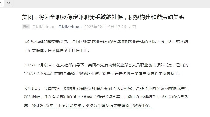 美团选择跟进社保 在京东出招之后大约7个小时后,美团选择跟进。 19日晚间,美团官方公众号发文,为积极构建和谐劳动关系,美团根据新就业形态的特点和新就业群体的实际需求,认真落实骑手权益保障,持续推进骑手社保工作,目前正在搭建骑手社保相关的信息系统,预计2025年二季度开始实施,逐步为全职及稳定兼职骑手缴纳社保。